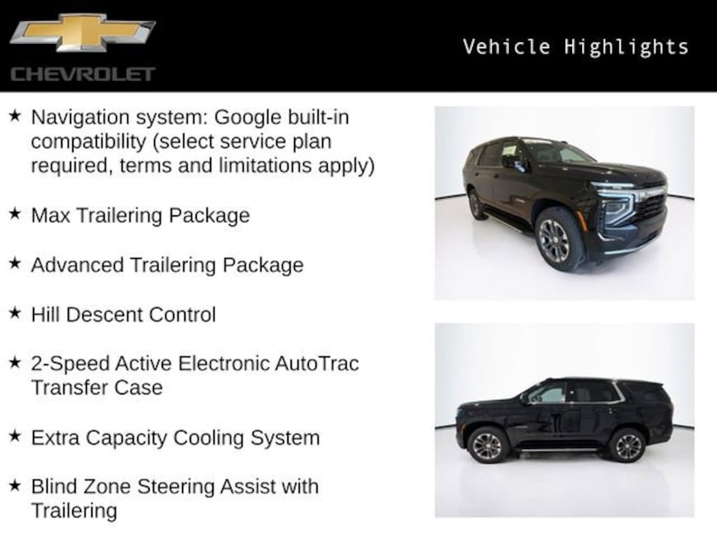 Black 2026 Chevrolet Tahoe LS 4WD 10-Speed Automatic with Overdrive EcoTec3 5.3L V8 Tahoe LS, 4D Sport Utility, EcoTec3 5.3L V8, 10-Speed Automatic with Overdrive, 4WD, Black, Jet Blk Clth Cloth, 2-Speed Active Electronic AutoTrac Transfer Case, Advanced Trailering Package, Blind Zone Steering Assist with Trailering, Extra Capacity Cooling System, Hill Descent Control, Hitch View with Pan/Zoom Image Adjustment, Integrated Trailer Brake Controller, Max Trailering Package, Navigation system: Google built-in compatibility (select service plan required, terms and limitations apply), Smart Trailer Integration Indicator.