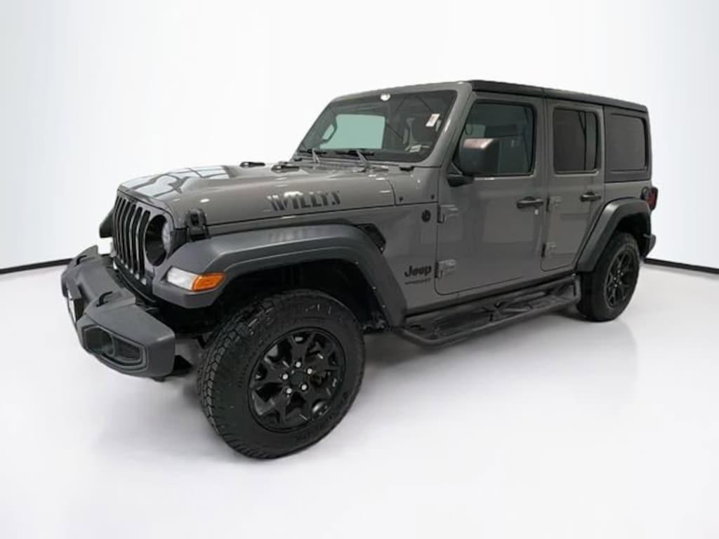 Sting-Gray Clearcoat 2021 Jeep Wrangler Unlimited Willys 4WD 8-Speed Automatic 3.6L V6 24V VVT Wrangler Unlimited Willys, 4D Sport Utility, 3.6L V6 24V VVT, 8-Speed Automatic, 4WD, Sting-Gray Clearcoat, Black Cloth, 4-Wheel Drive Swing Gate Decal, 7.0" Touchscreen Display, Air Conditioning w/Auto Temperature Control, Air Filtering, Anti-Spin Differential Rear Axle, Apple CarPlay, Automatic Headlamps, Black Grille, Black Trail Rated Badge, Cluster 7.0" TFT Color Display, Cold Weather Group, Convenience Group, Deep Tint Sunscreen Windows, For More Info, Call 800-643-2112, Front 1-Touch Down Power Windows, Front LED Fog Lamps, Google Android Auto, GPS Antenna Input, Heated Front Seats, Heated Steering Wheel, Integrated Center Stack Radio, Leather Wrapped Steering Wheel, LED Headlamp & Fog Lamp Group, LED Premium Reflector Headlamps, Matte Black Jeep Badge, Mold In Color Bumper w/Gloss Black, MOPAR All-Weather Floor Mats, ParkView Rear Back-Up Camera, Power Heated Mirrors, Quick Order Package 23W Willys, Quick Order Package 24W Willys, Radio: Uconnect 4 w/7" Display, Remote Keyless Entry, Security Alarm, SiriusXM Radio Service, SiriusXM Satellite Radio, Speed Sensitive Power Locks, Sun Visors w/Illuminated Vanity Mirrors, Technology Group, Universal Garage Door Opener, USB Host Flip, Wheels: 17" x 7.5" Moab Black Aluminum, Willys, Willys Hood Decal, Wrangler Decal.